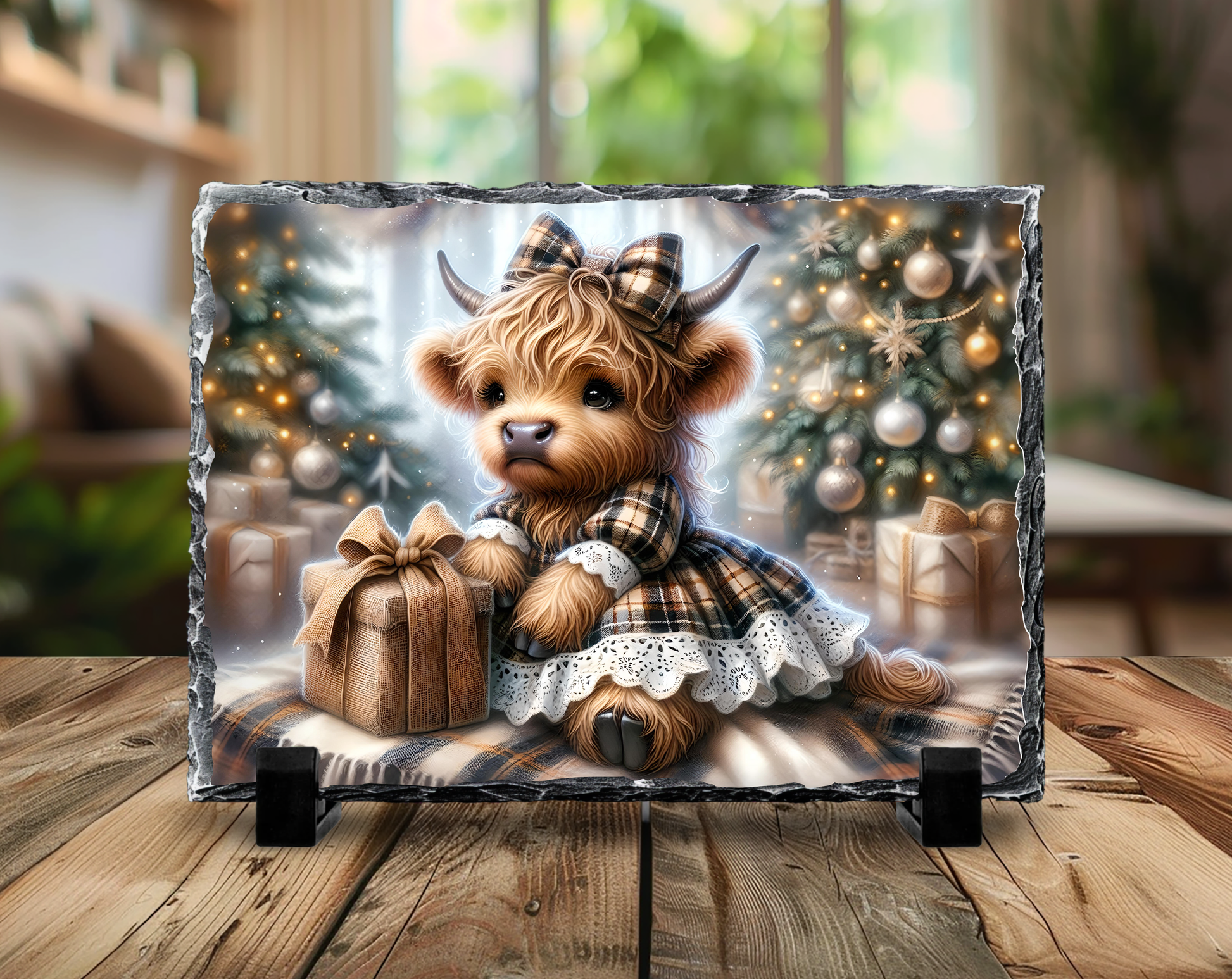 Enhance your holiday decor with this 5.5” x 7.5” photo frame crafted from authentic natural slate. Featuring a delightful highland cow in festive attire, this frame brings warmth and cheer to your seasonal setup. Equipped with sturdy display stands, it’s perfect for mantles or tabletops, offering both stability and style. An ideal gift or festive addition, this photo frame combines rustic charm with holiday spirit, making it a must-have for your celebrations. Celebrate the season with this enchanting decorative piece.
