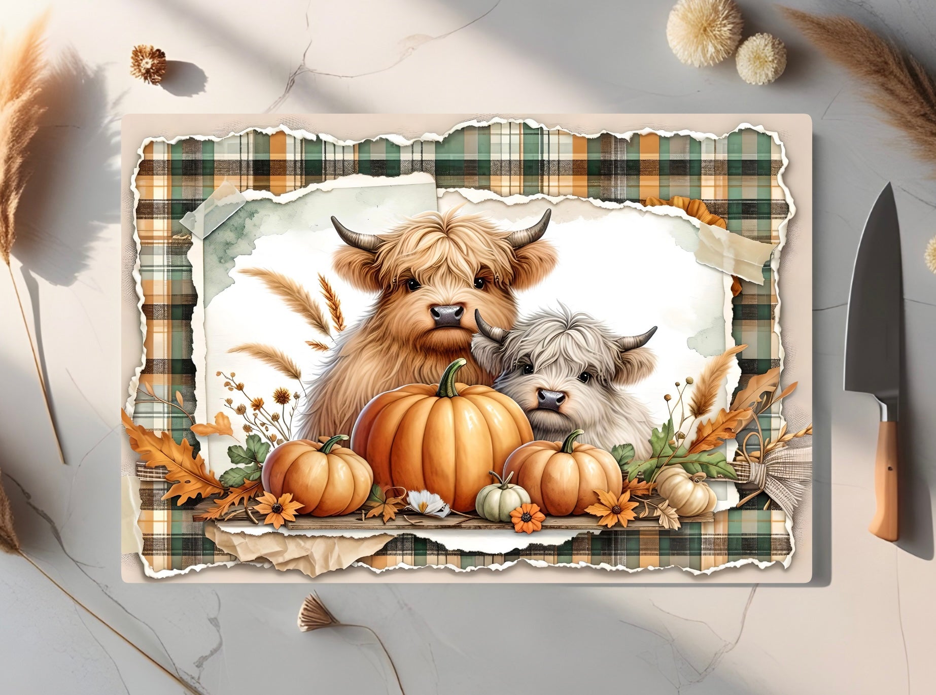 Introduce rustic elegance to your kitchen with the Highland Cow Tempered Glass Cutting Board. This beautifully designed board showcases charming highland cows amidst a picturesque plaid and autumnal backdrop, making it a perfect centerpiece for your kitchen decor.